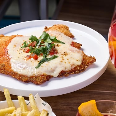 Mains range from vegetarian delights like Tomato & Basil Spaghetti or Ravioli Fiorentina to hearty options such as Spaghetti Carbonara and Italian Panini, and premium choices such as Prawn & Asparagus Risotto, Italian Porchetta, or crispy-on-the-outside and tender-on-the-inside Chicken Parmigiana with Mozzarella, tomato sauce, and Parmesan fries.