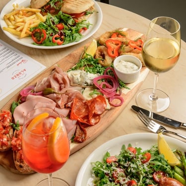 豐盛的意大利滋味早午餐由可供分享的前菜拼盤來打開序幕,包括意式精選凍肉、脆炸魷魚配酸豆及檸檬蛋⿈醬、及香脆烤蒜蓉麵包配新鮮意大利番茄。
