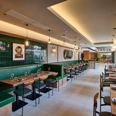 Ask for Alonzo 沙田新店在室內設計上巧妙融合了簡約與俐落的極簡主義元素,營造出舒適明亮的用餐環境。室內用餐室提供70個座位,以森林綠色餐椅、木餐桌,以及森林綠色瓷磚打造出平衡而充滿活力的美感,而裝飾著意大利飲食文化靈感的藝術掛畫及鏡子,提升了空間的活力氛圍。溫暖的吊燈則為整體環境增添了更多舒適感。
