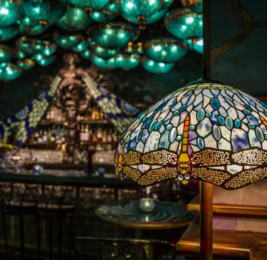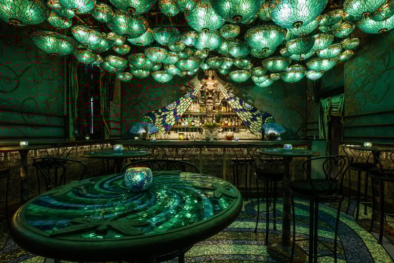 隱身於歷史古蹟大館裏,堪稱香港最美酒吧之一,Dragonfly 的波希米亞沙龍將客人重回19世紀末,設計靈感來自歐洲新藝術(Art Nouveau)及大自然之美的神秘氛圍。這個由獲獎著名設計師Ashley Sutton傾力打造的空間,融合了引人入勝的異世界元素,捕捉了所有感官的想像,完美呈現了頹廢與永恆藝術的精髓。