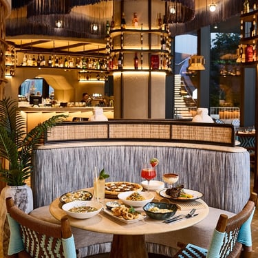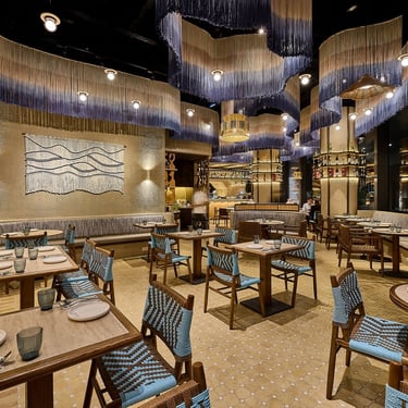 Upon entering La Baia, guests are greeted by a striking woven fabric installation in hues that echo ocean waves against sandbanks, flowing across the ceiling and establishing the desired coastal ambience.