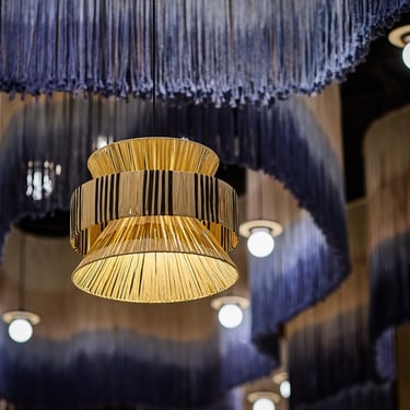 An abundance of natural light floods the space through expansive floor-to-ceiling windows, elevating the sophisticated yet inviting atmosphere. As day turns to dusk, the space glows with a warm golden light from banks of suspended fabric pendant lamps, crafted to emulate bamboo, creating a serene island vacation feel that encourages guests to relax and enjoy their meals at leisure.