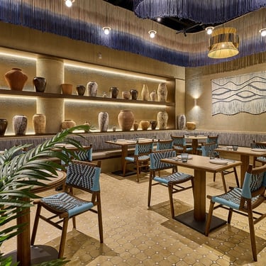 Plaster walls in earthy tones are complemented by vintage-inspired ceramic tile flooring, while elegant stone dining tables paired with handcrafted bamboo partitions create a rustic charm. Comfortable upholstered banquette seating and wooden chairs with handwoven details in shades of blue and brown invite a homely yet stylish atmosphere, accentuated by lush greenery and earthenware vases.