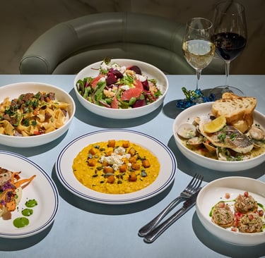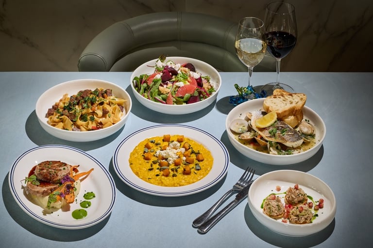 The evening begins with a selection of starters that embody the generosity and indulgence of a true French réveillon. Rich and velvety, the Foie Gras Terrine is served with chutney and grilled bread, offering a luxurious first bite that balances sweetness, acidity and the buttery depth of foie gras. Classic Escargots arrive bathed in fragrant garlic butter, a comforting, aromatic favourite that speaks of Parisian bistros and timeless tradition. For seafood lovers, the Crab Blinis provide a lighter, refreshing alternative: delicate pancakes crowned with sweet crab, bright pops of pomegranate and a cool dollop of crème fraîche. Those in the mood to share can linger over the French Charcuterie Platter, an inviting spread of Bayonne ham, cooked ham and Jésus cured sausage that pairs perfectly with an apéritif. Meanwhile, the classic French Onion Soup brings warmth and nostalgia with its slow‑caramelised onions and savoury depth, while the Beef Tartare, served with grilled bread, offers a more robust, boldly flavoured start to the meal.