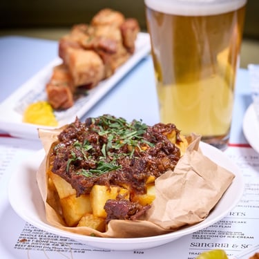 Crispy patatas meet slow-braised oxtail in a dish that captures the deep, wine-led savouriness of Andalusia. Traditionally, this enjoyed as a street-style tapa in southern Spain, rabo de toro is known for its gelatine-rich sauce that turns silky with long cooking, and its lore is often linked to bullfighting-era feasts, with stories that even trace it back to Roman times. At Qué Pasa, the potatoes are deliberately crisped to soak up the braising juices, creating a moreish contrast of crunch and richness. Chef Amaru finishes the dish with a savoury chilli crunch, adding a controlled heat and extra texture that brightens every bite.