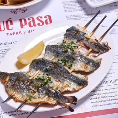 Charcoal-grilled sardines are one of Spain’s great coastal pleasures, closely associated with Málaga province in Andalusia, where open-coal sardines are a chiringuito ritual by the sea. The flavour is clean and briny with smoky skin, heightened by coarse sea salt and the natural sweetness of the fish itself. At Qué Pasa, parsley and garlic oil add a fresh herbal bite and pungent richness that complements the charcoal notes. It’s simple, direct and deeply Mediterranean—the kind of dish that makes a glass of crisp white feel mandatory.