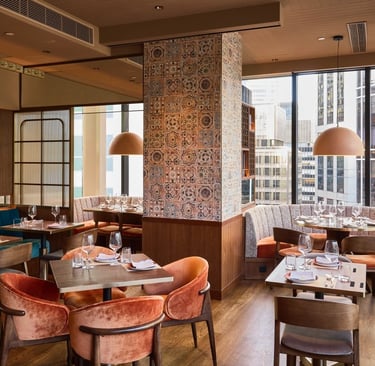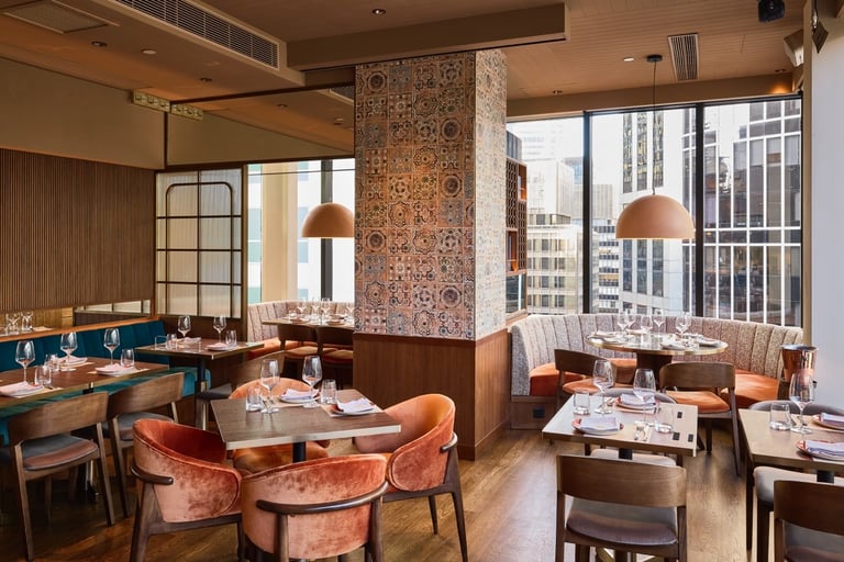 Quiero Más由著名設計大師Hernan Zanghellini及其ZHA+MA2工作室的團隊精心設計。室內用餐室以地中海度假風及南歐洲小鎮為靈感,融入裝飾藝術風格,以襯托出繁華都市的美景。鮮明的藍綠色長椅卡座配搭活潑橙色餐椅及優雅木製餐桌,營造出時尚歐陸美學。空間更以鈷藍及銅色裝飾點綴,如此一切的搭配更是相得益彰。隨著夕陽西下,柔和燈光為餐廳營造出活潑的社交用餐氛圍,打造滿滿的異域風情。