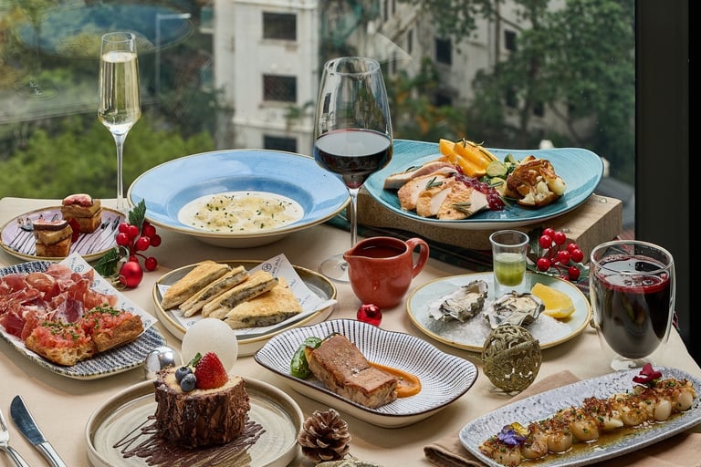 於 2025 年 12 月 25 日及 26 日(星期四及星期五)中午 12 時至下午 3 時供應;聖誕節早午餐包括四款共享前菜,每人自選一道主菜及一份甜品,每位HK$368