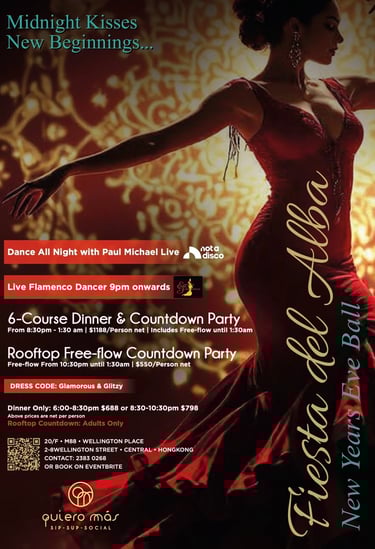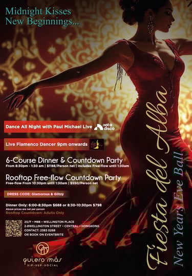 Quiero Más將於 2025 年 12 月 31 日舉行「Fiesta Del Alba 除夕晚宴及天台倒數派對」,以充滿節奏感與華麗氣息的派對形式歡送 2025,並以美食、美酒與音樂迎接嶄新的 2026。是次除夕派對靈感源自西班牙「Nit de l'Albà」(直譯為「黎明之夜」),象徵新開始的光芒與能量。Fiesta Del Alba 以此為主題,將節慶的歡樂、華麗與希望匯聚於一夜之間,邀請賓客在 Quiero Más 以美饌佳釀、炫目佛蘭明高舞蹈表演與動感音樂一同迎接新一年 ...