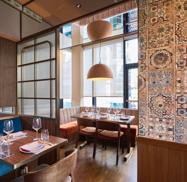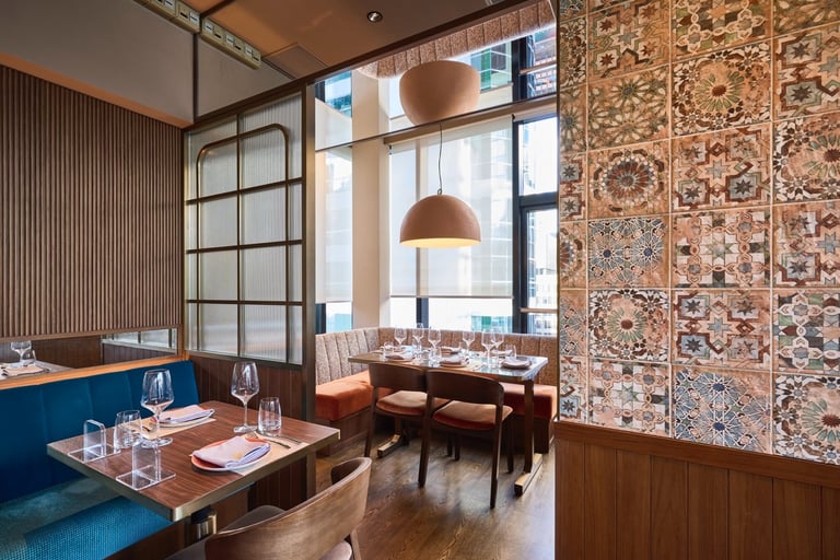 Quiero Más由著名設計大師Hernan Zanghellini及其ZHA+MA2工作室的團隊精心設計。室內用餐室以地中海度假風及南歐洲小鎮為靈感,融入裝飾藝術風格,以襯托出繁華都市的美景。鮮明的藍綠色長椅卡座配搭活潑橙色餐椅及優雅木製餐桌,營造出時尚歐陸美學。空間更以鈷藍及銅色裝飾點綴,如此一切的搭配更是相得益彰。隨著夕陽西下,柔和燈光為餐廳營造出活潑的社交用餐氛圍,打造滿滿的異域風情。