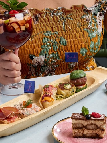 The Bayside的地中海風味下午茶拼盤,以舒心地中海風味佳餚為主題,主打鹹香可口小食,當中包括:與香脆的加泰隆尼亞番茄橄欖油多士搭配的伊比利亞黑毛豬火腿;三文魚他他;採用新鮮蟹肉、蛋黃醬、塔巴斯科辣椒醬及芥末製成的香煎蟹餅,外層香脆,內裏鮮嫩;以香脆炸鱈魚柳及爽脆包心菜絲製成的香炸鱈魚夾餅;嫩滑多汁的和牛迷你漢堡;以及以濃郁軟滑、甜而不膩的提拉米蘇作為結尾,為整個鹹香佳餚增添均衡甜味。