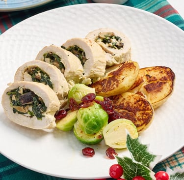 自選一款主菜:番茄海鮮意大利闊條麵;慢烤火雞胸,配抱子甘藍、烤馬鈴薯及甜酸蔓越莓醬;