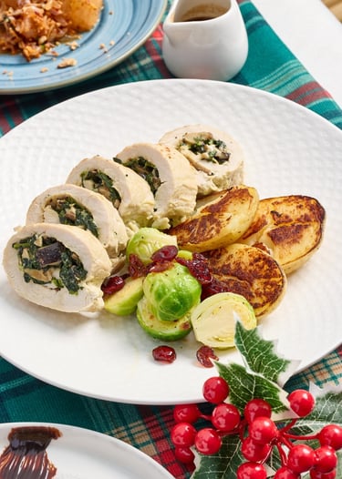 自選一款的主菜:慢烤火雞雞胸肉,配抱子甘藍、烤馬鈴薯及甜酸蔓越莓醬;濃郁大蝦蛋忌廉咖喱搭配香脆法包;香煎乾式熟成和牛腹肉,伴紅酒醬及有機蔬菜,或是紅咖哩燉蔬菜。熱愛海鮮的賓客更可選擇充滿地中海風情的西班牙龍蝦海鮮飯,呈現滿滿的節日氣氛。